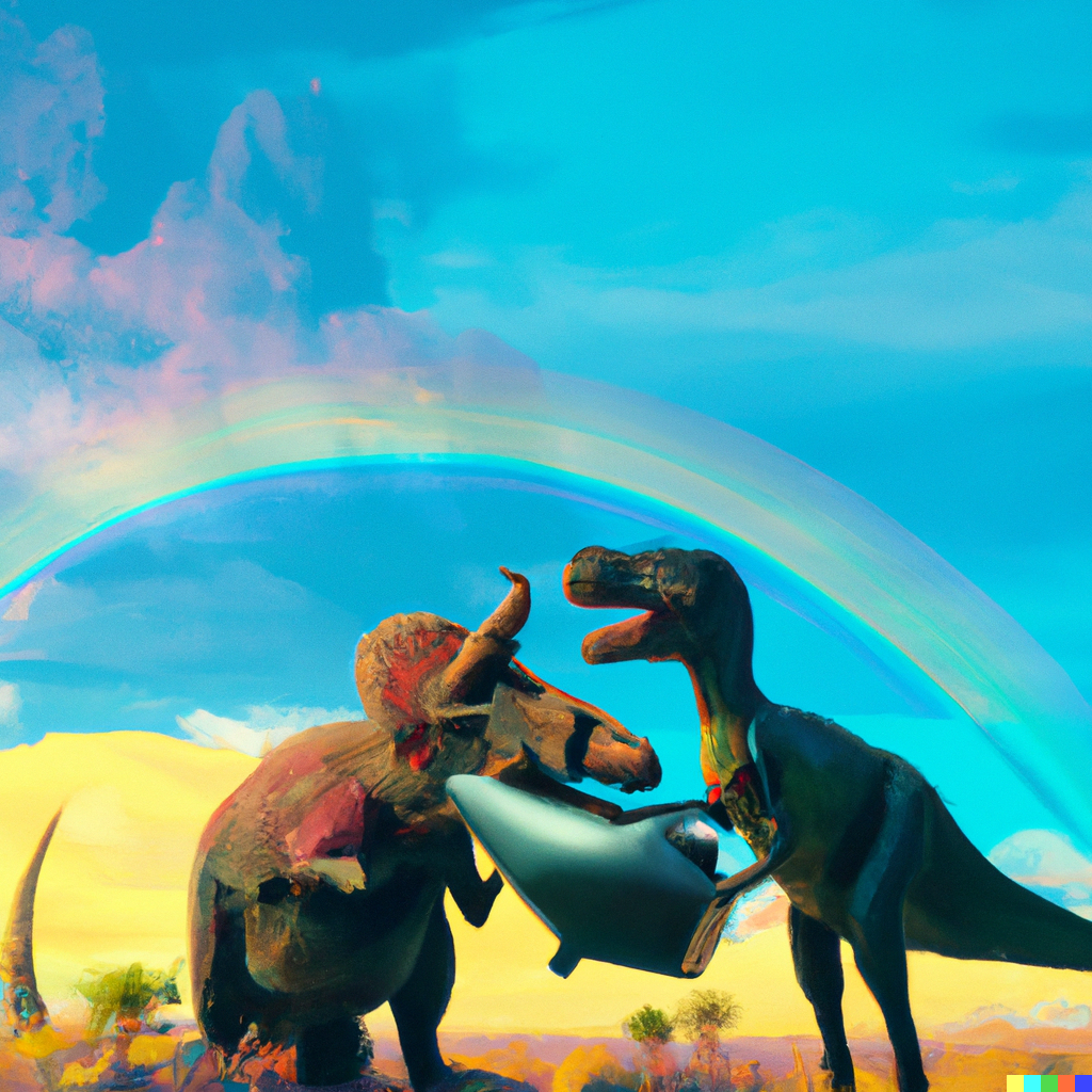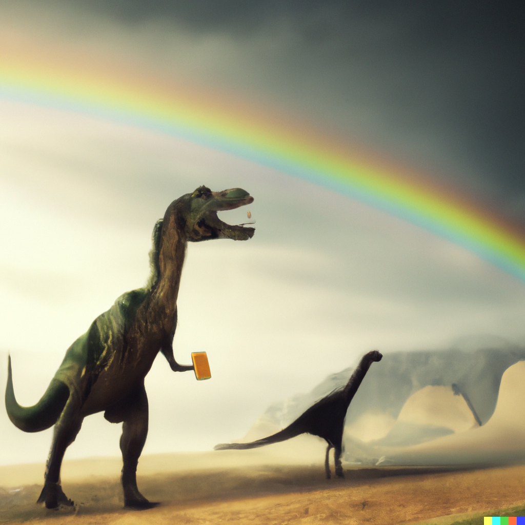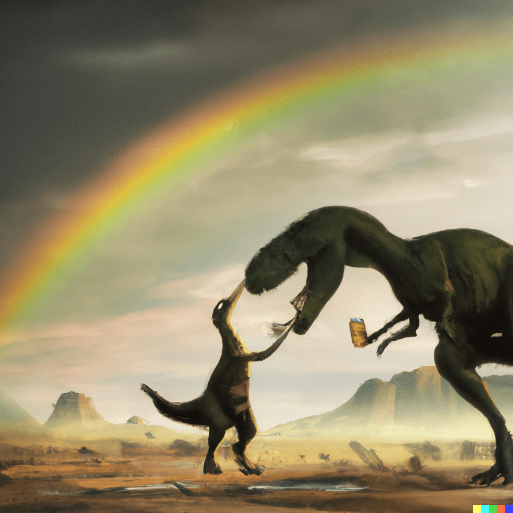A portrait of a dinosaur with small arms handing a can he cannot open to a friend-dinosaur who can open that can can spread a virulent dose of motivation.